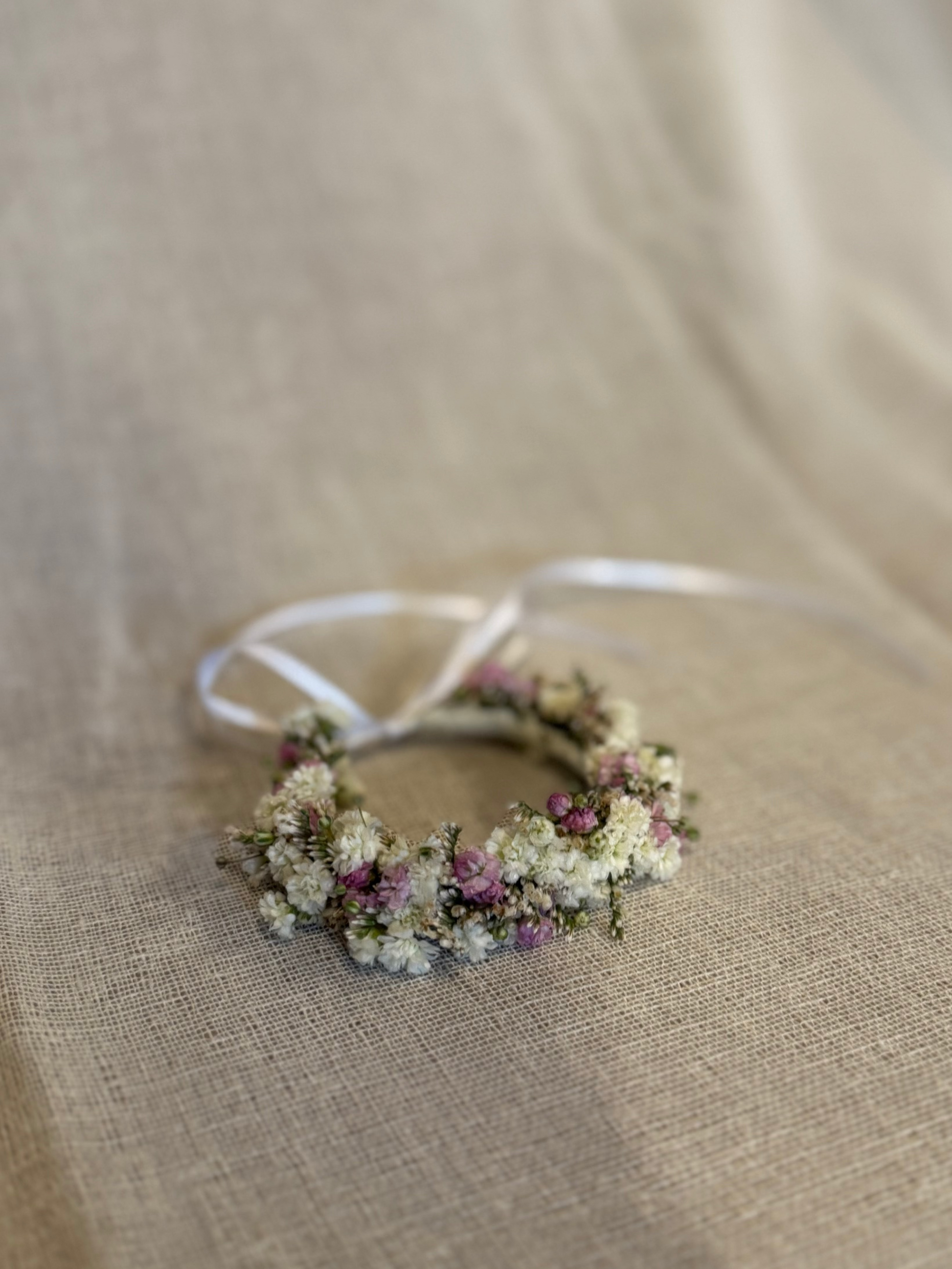 Veldu litaþema og/eða blómtegundir í skilaboðum, einnig þarf ummál á úlnliði.