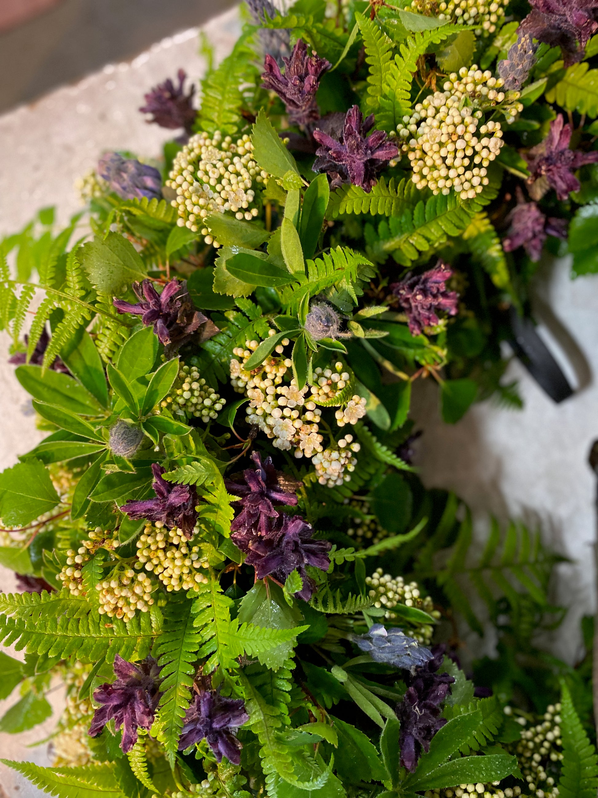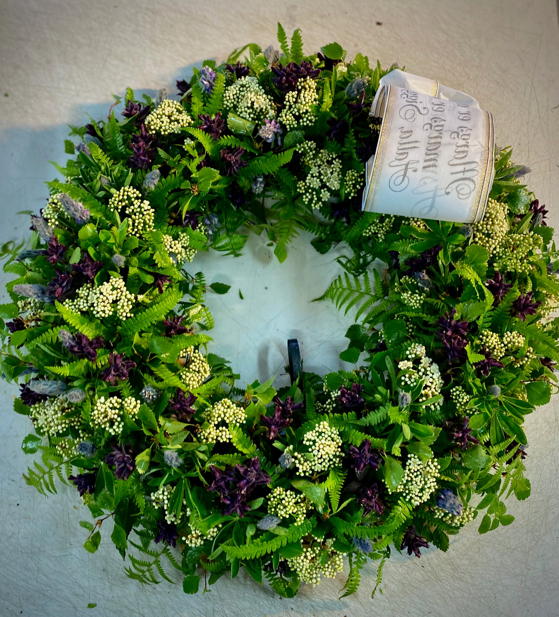 Umhverfisvænn útfarakrans með blómum tíndum í íslenskri náttúru. Gert úr fibrefloral stungumassa sem er náttúrulegt efni og biolit pappabakka sem er 100% niðubrjótanlegur.
