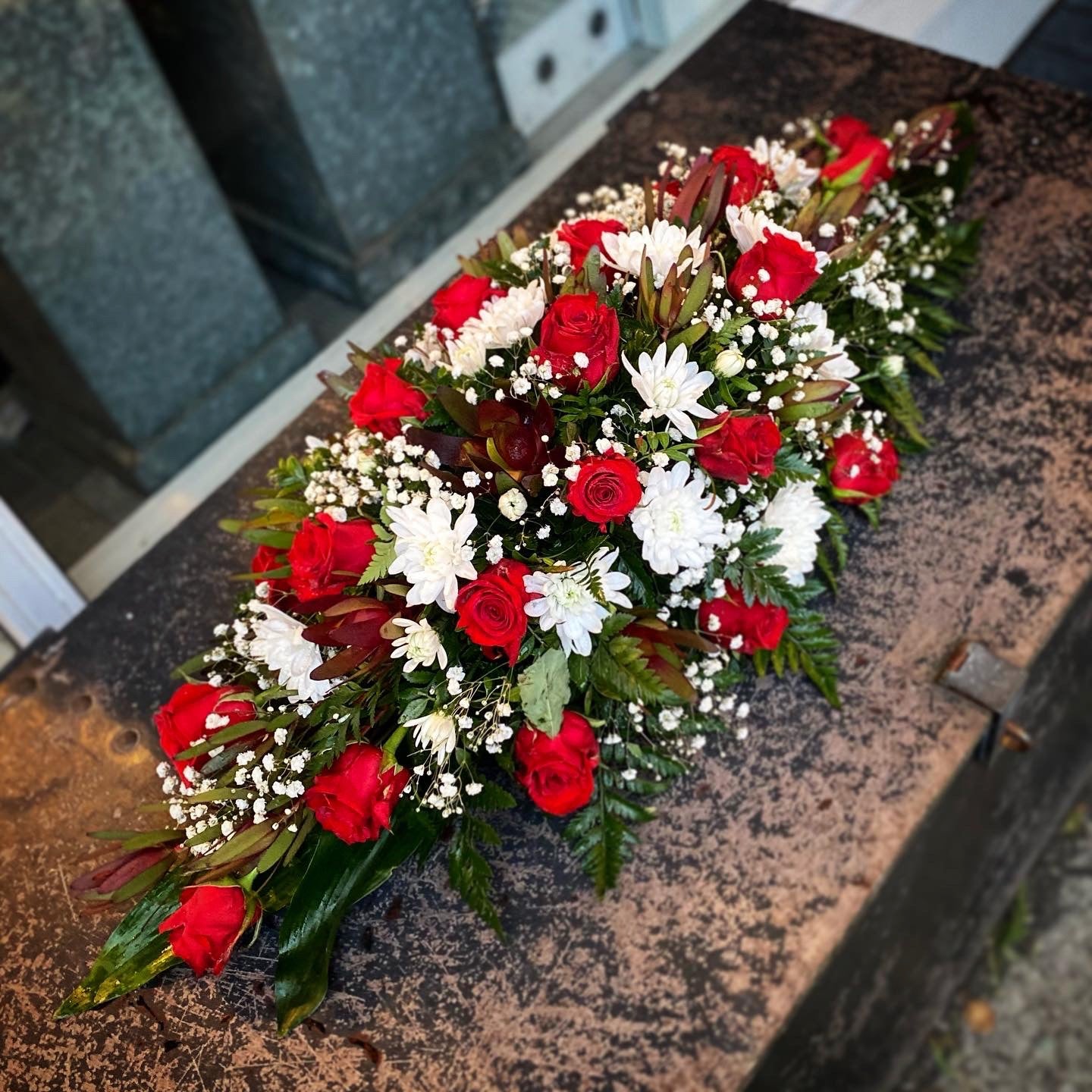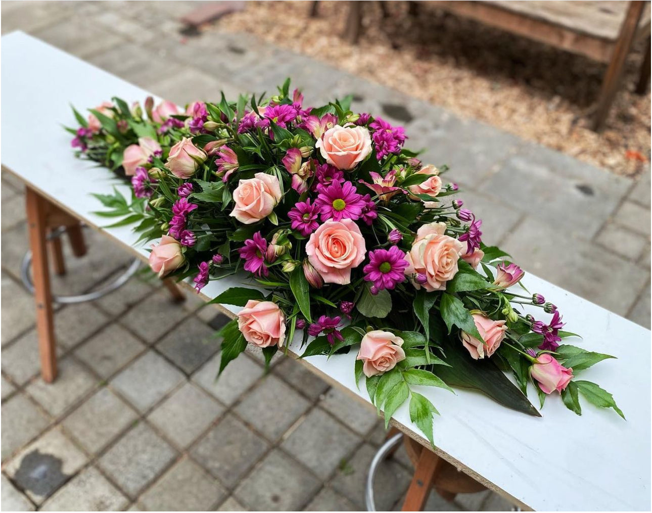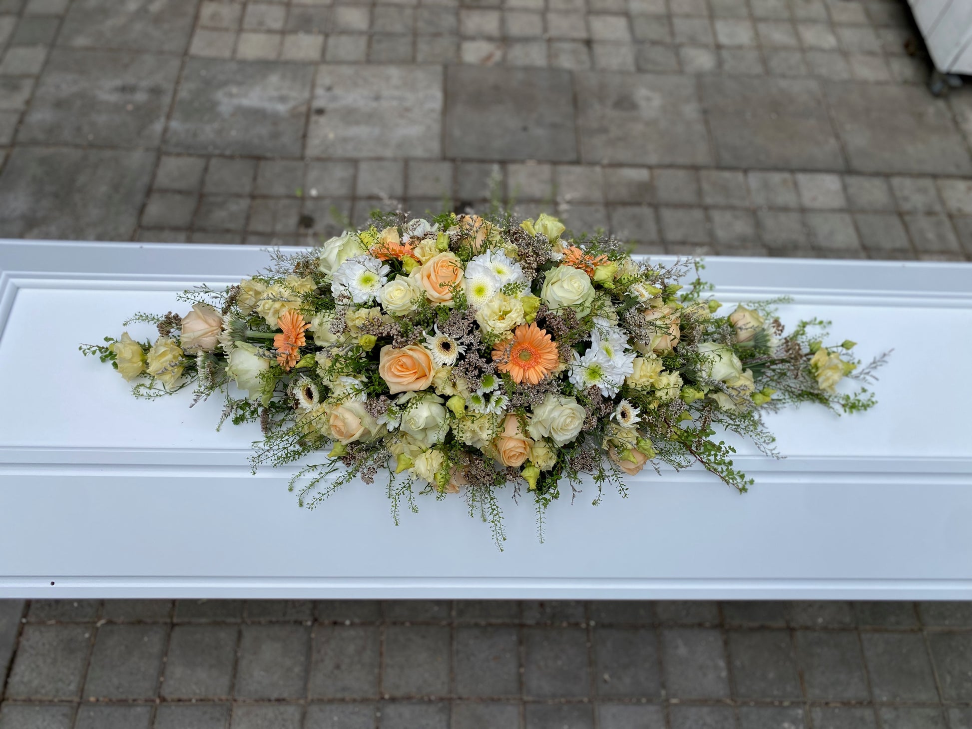 Umhverfisvæn kistuskreyting. Gerð með fibrefloral stungumassa sem er náttúrulegt efni og biolit pappabakka sem er 100% niðurbrjótanlegur.