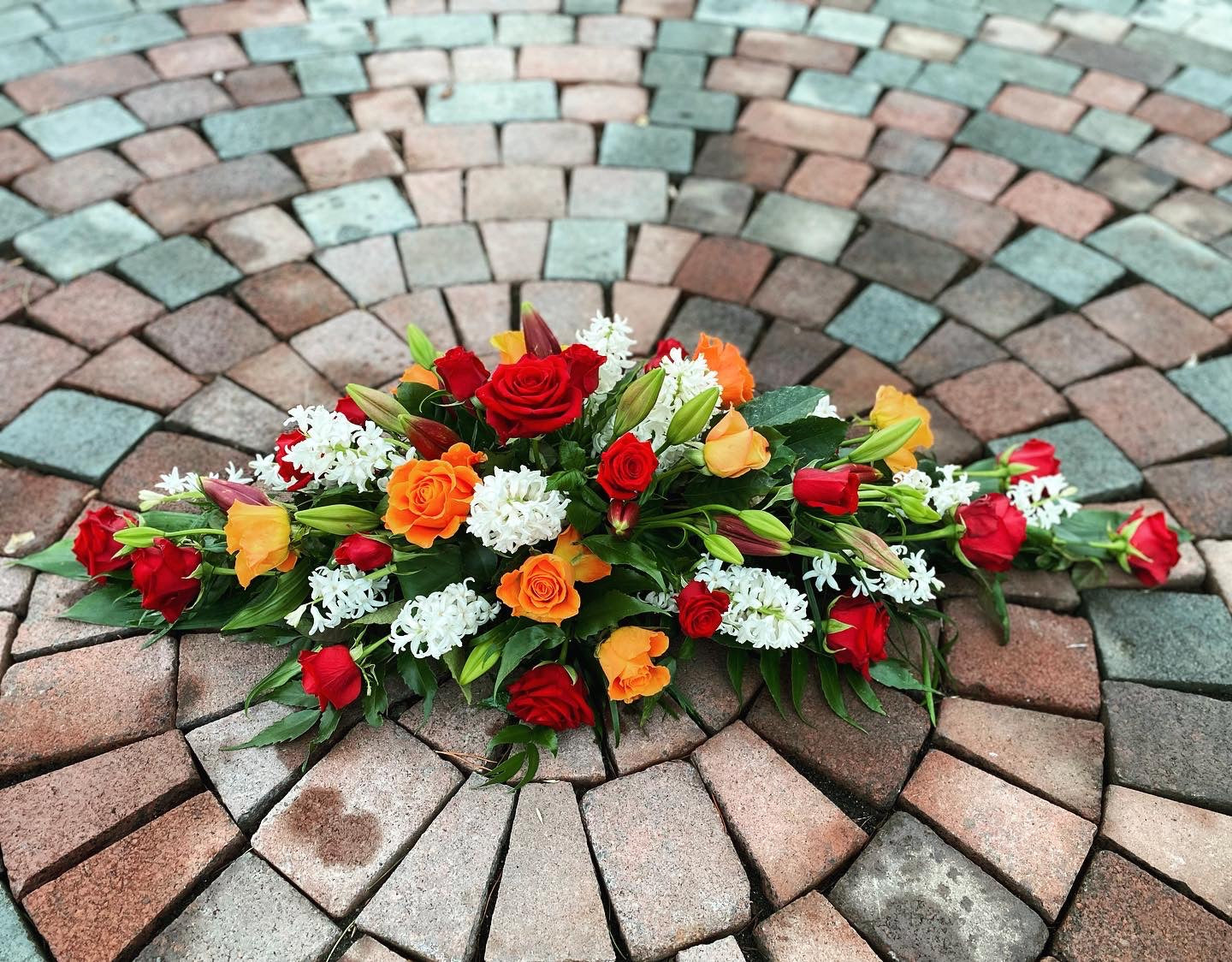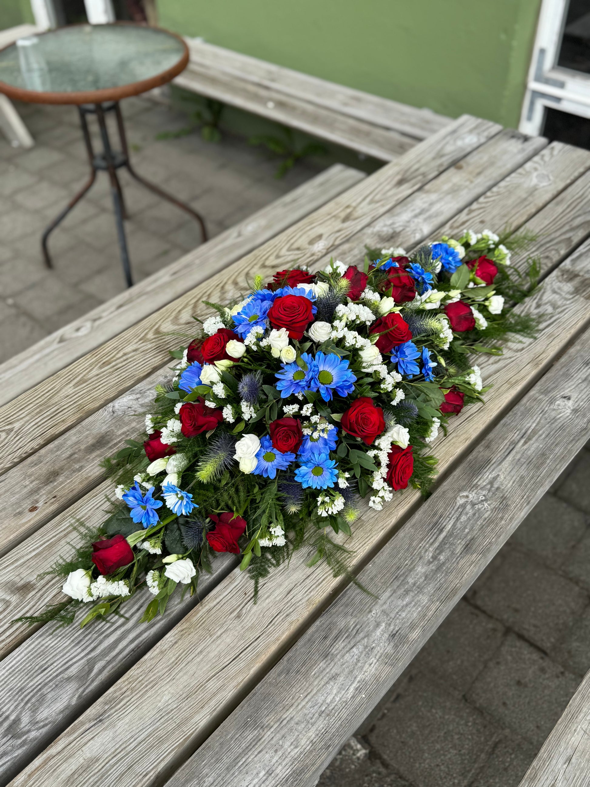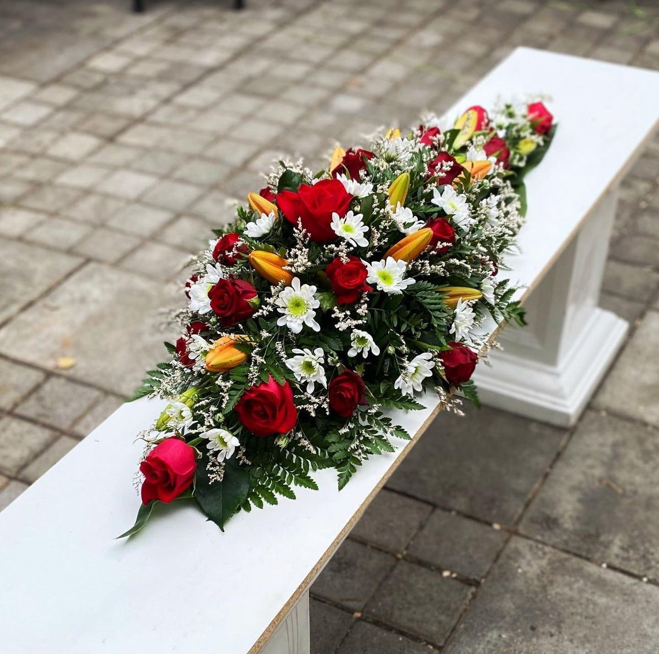 Umhverfisvæn kistuskreyting. Gerð með fibrefloral stungumassa sem er náttúrulegt efni og biolit pappabakka sem er 100% niðurbrjótanlegur.