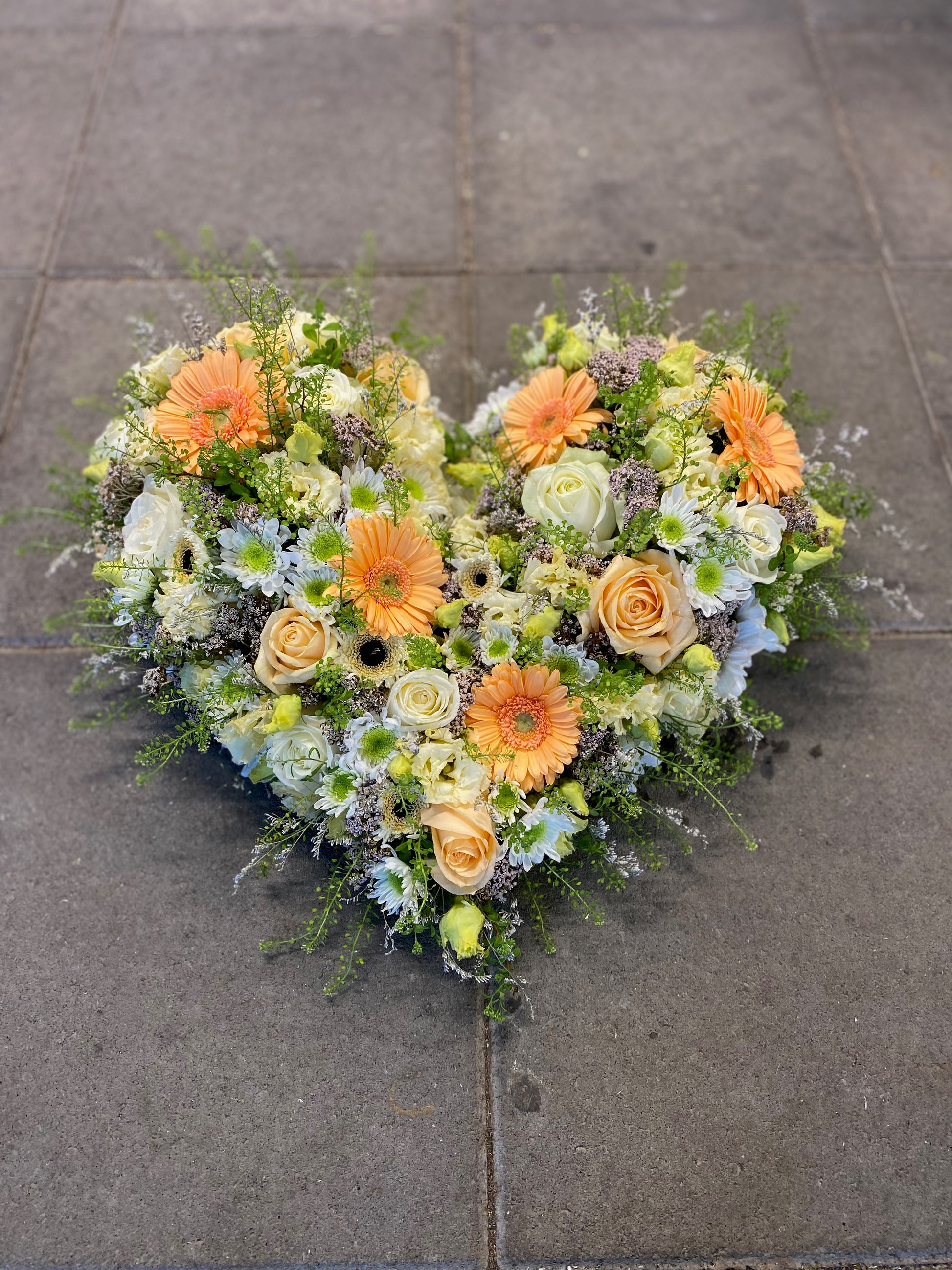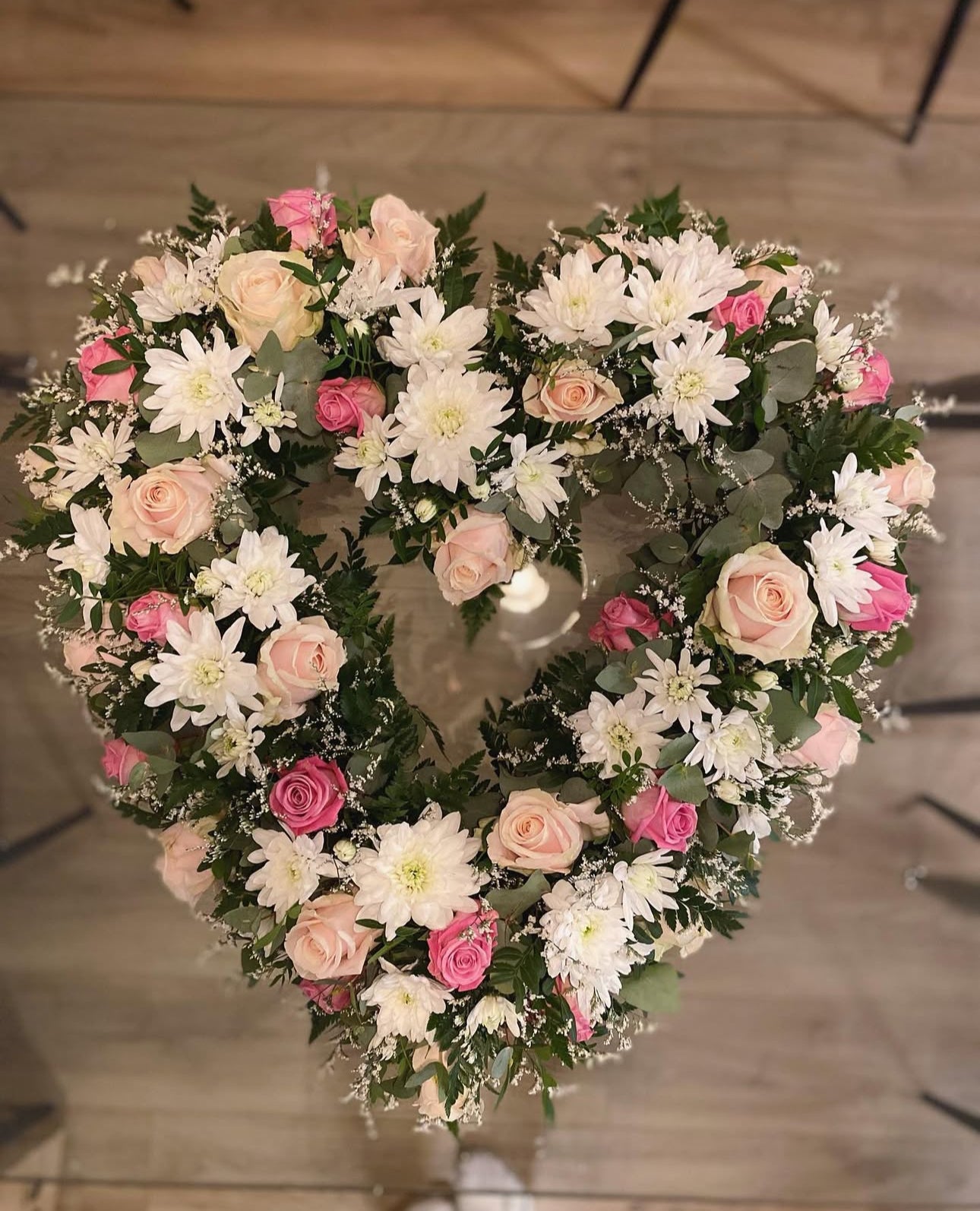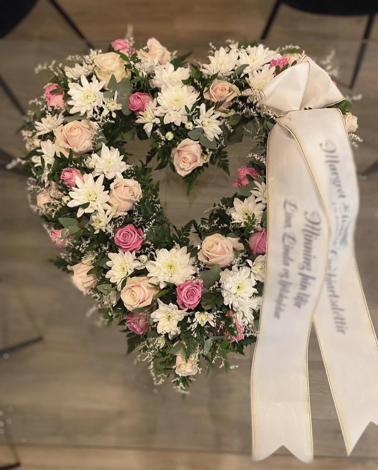 Umhverfisvænt útfarahjarta, lokað (40-50cm). Gert með fibrefloral stungumassa sem er náttúrulegt efni og biolit pappabakka sem er 100% niðurbrjótanlegur.