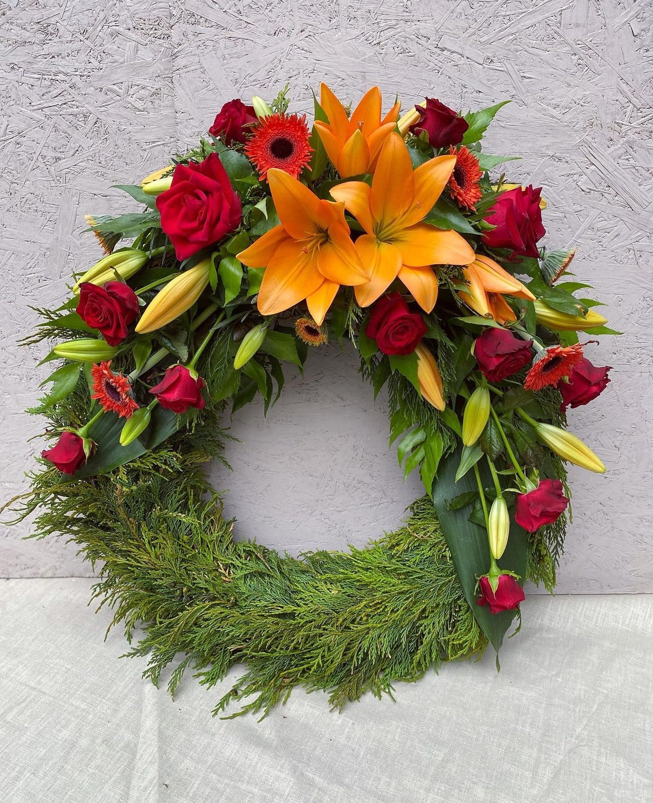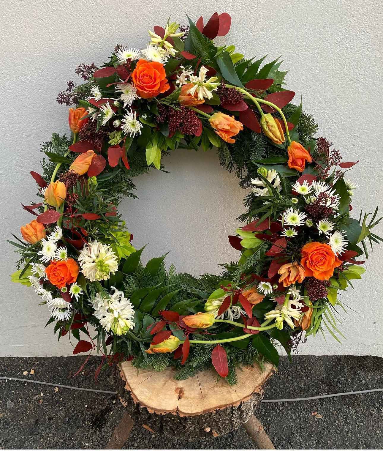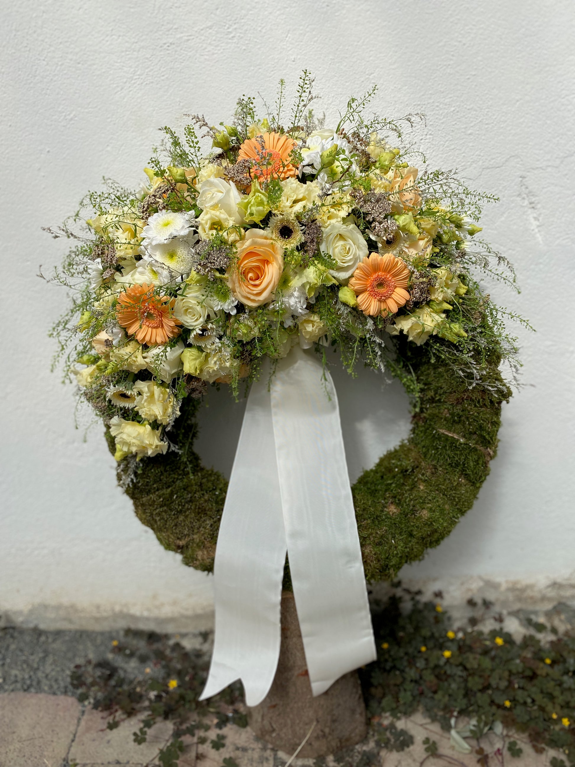 Umhverfisvænn útfarakrans í hefðbundnum stíl, vafinn með skreytingu/m. Gerður með fibrefloral stungumassa sem er náttúrulegt efni og íslenskum hálmkrans sem er 100% niðurbrjótanlegur.