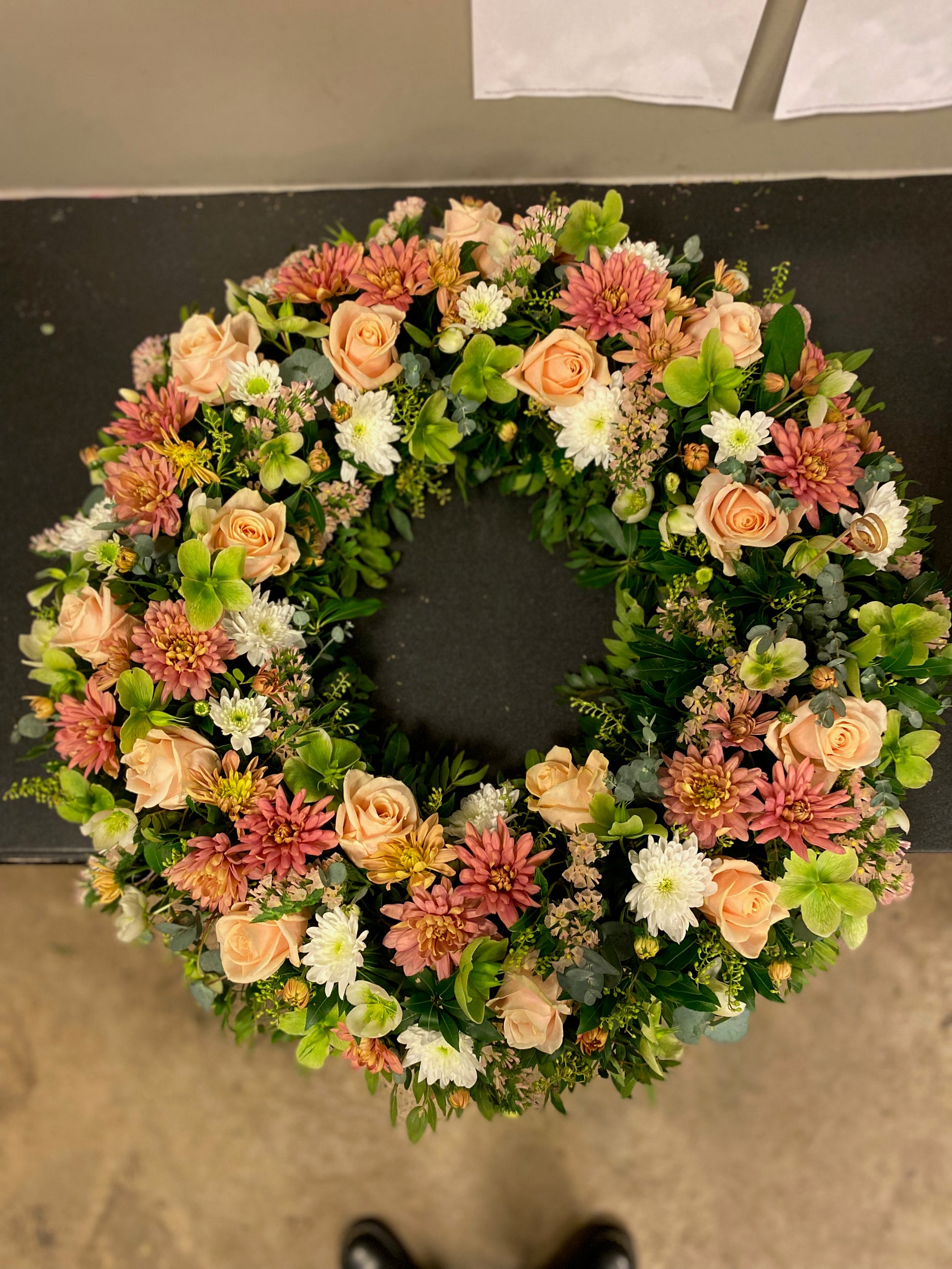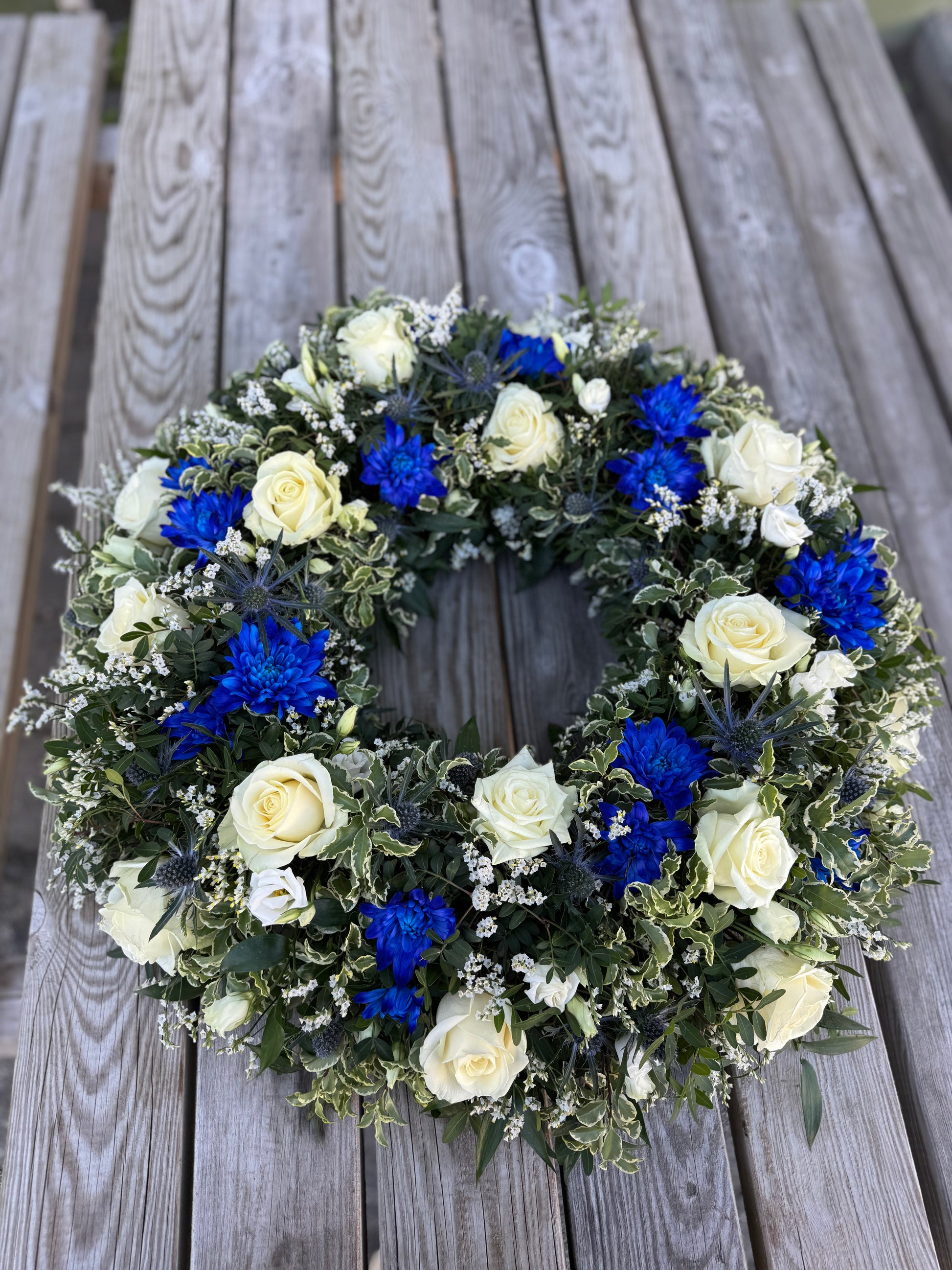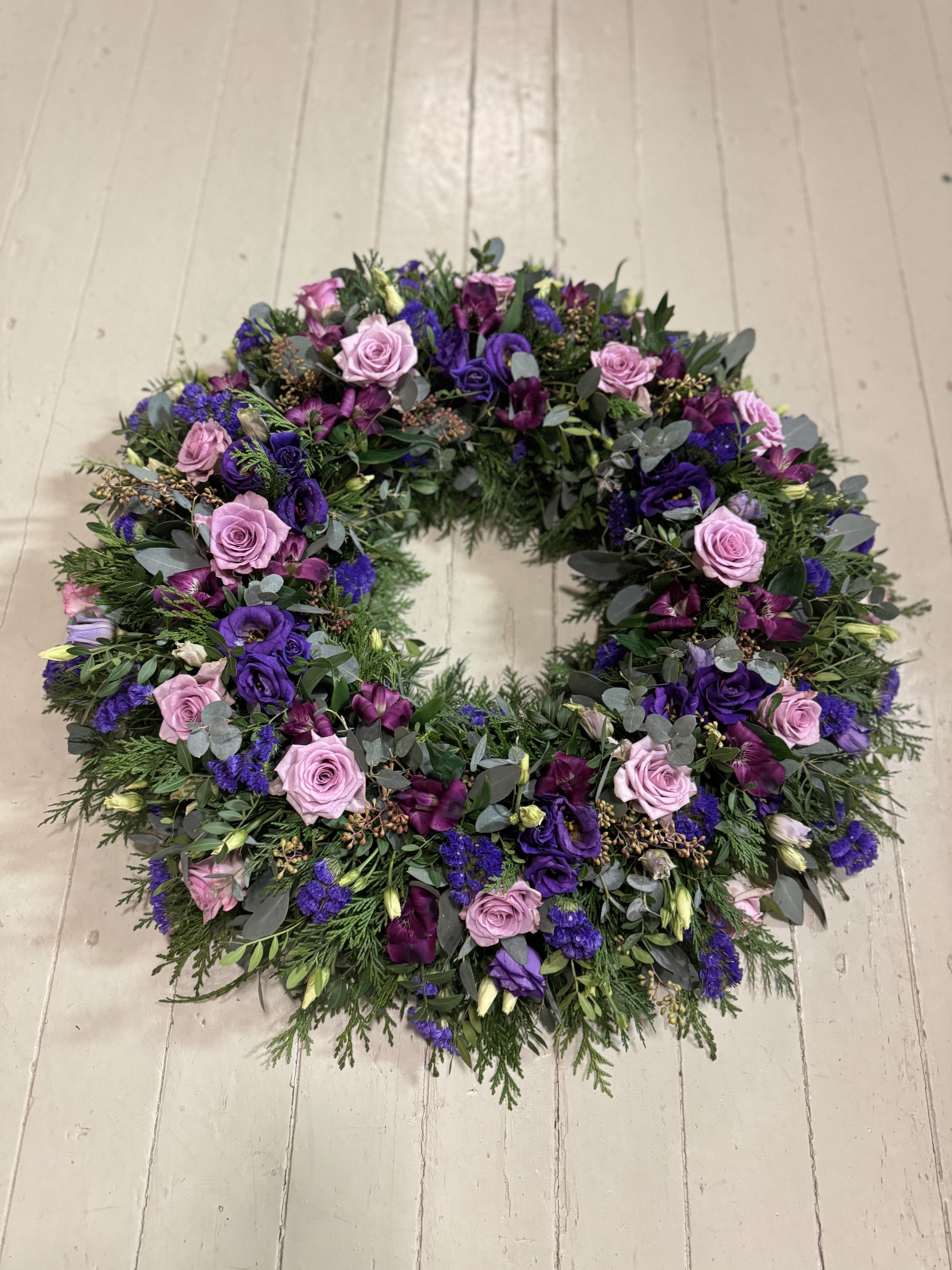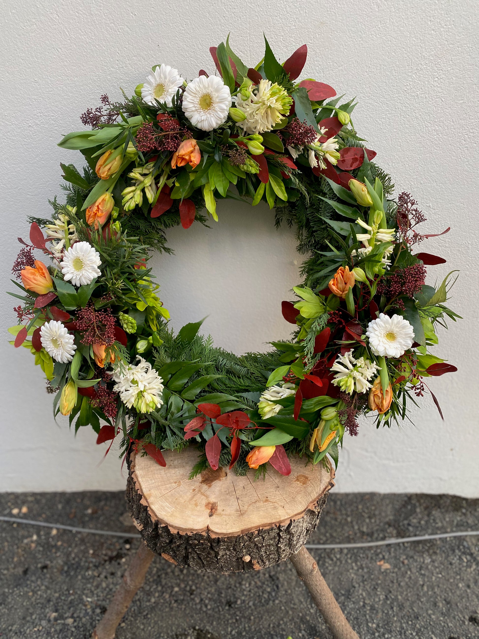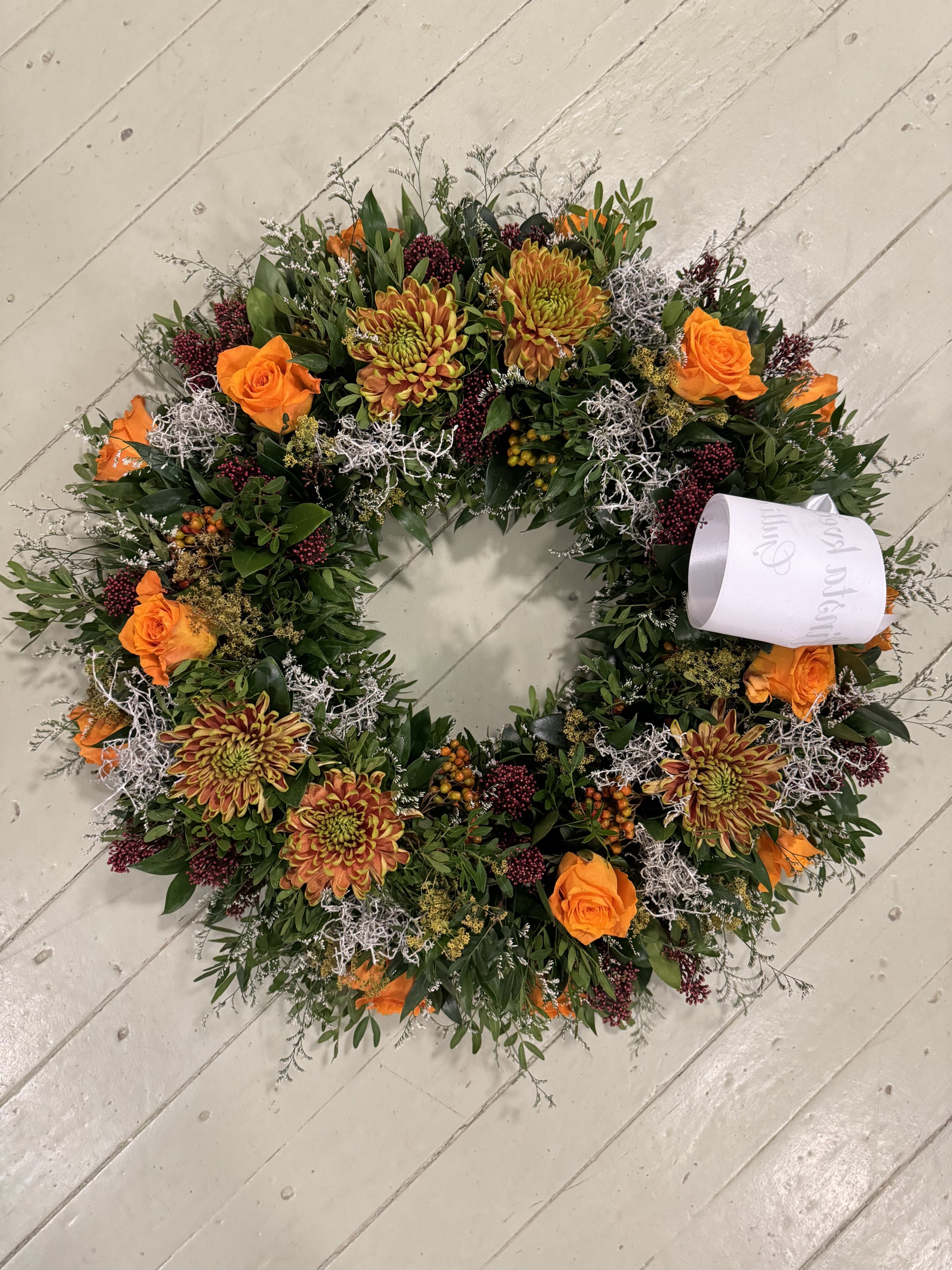 Umhverfisvænn útfarakrans, hringskreyttur. Gerður með fibrefloral stungumassa sem er náttúrulegt efni og biolit pappabakka sem er 100% niðurbrjótanlegur.